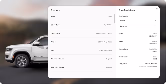 A quick-look table like interface for users to read & understand key features of the car. The summary page also provides users with option to book a test drive or submit an enquiry online directly to the brand.